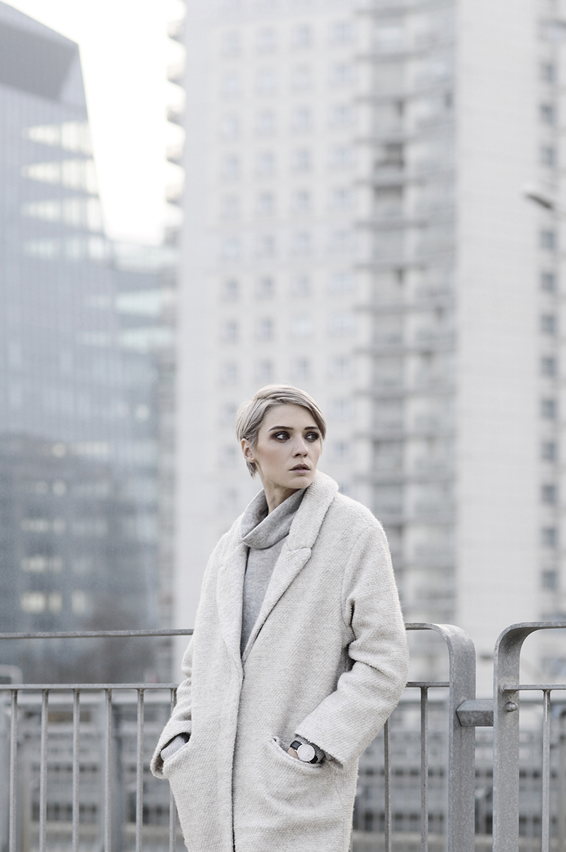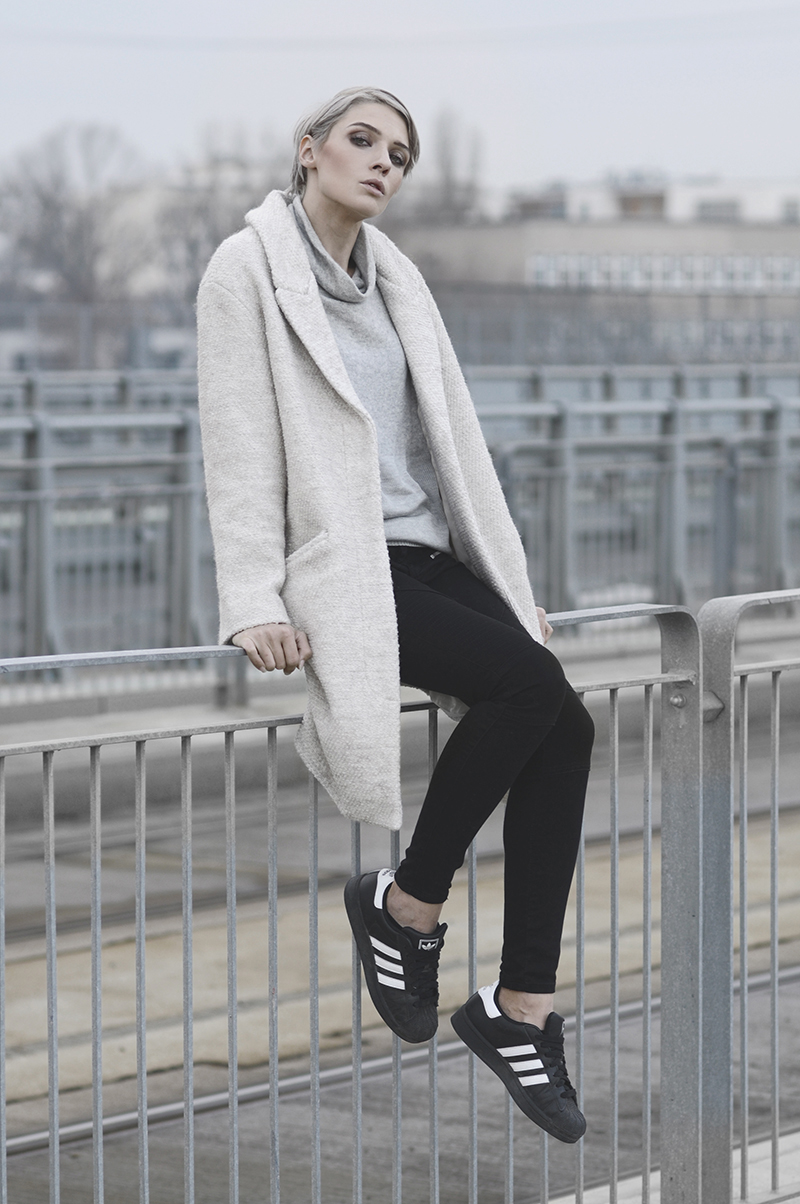 Ale koniecznie chciałam pochwalić sie Wam tymi zakupami – pisałam ostatnio na Facebooku o cudownym płaszczu oversize, męskim jakby, ale poszłam sprawdzić i rozczarowałam sie – krój ok, leżał fajnie, strasznie drogi był. I wtedy przypomniałam sobie jak zwykle o New Yorkerze, ta sieciówka zawwsze i od lat niezawodnie przychodzi mi z pomocą, gdy szukam niedrogich, ale fajnych rzeczy. Lubię ten sklep, bo jest tam masa ciuchów w różnych stylach, co sprawia, że zawsze mocno sie tam inspiruję odkrywając ciekawe połączenia i wychodzę obładowana siatami. I tym razem też sie nie zawiodłam – znalazłam perfekcyjny, wełniany płaszcz za 349 zł, czyli za połowę ceny od tego, który początkowo mi się podobał, do tego płaszcza dobrałam spodnie motocyklówki i miękki, szary, luźny golf, które wpadły mi w oko podczas zakupów w New Yorkerze. To jeden z moich ulubionych zestawów na teraz, połączenie męskiego płaszcza, motocyklówek, uspokojone szarym, mięciutkim sweterkiem.